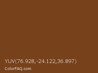 YUV 76.928,-24.122,36.897 Color is a dark orange color and the nearest color is Walnut #773f1a. Hex code #77411c and RGB value is rgb(119,65,28). In RGB color space, this color is composed of 47% red, 25% green, 11% blue, In CMYK color space, this color is composed of 0% cyan, 45% magenta, 76% yellow , 53% black , In HSL color space, this color has a hue angle of 24° , 62% saturation and 29% lightness.