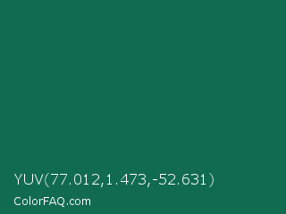 YUV 77.012,1.473,-52.631 Color is a dark green color and the nearest color is Dark Spring Green #177245. Hex code #116b50 and RGB value is rgb(17,107,80). In RGB color space, this color is composed of 7% red, 42% green, 31% blue, In CMYK color space, this color is composed of 84% cyan, 0% magenta, 25% yellow , 58% black , In HSL color space, this color has a hue angle of 162° , 73% saturation and 24% lightness.