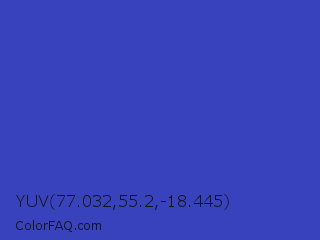 YUV 77.032,55.2,-18.445 Color is a normal blue color and the nearest color is Governor Bay #2f3cb3. Hex code #3842bd and RGB value is rgb(56,66,189). In RGB color space, this color is composed of 22% red, 26% green, 74% blue, In CMYK color space, this color is composed of 70% cyan, 65% magenta, 0% yellow , 26% black , In HSL color space, this color has a hue angle of 235° , 54% saturation and 48% lightness.