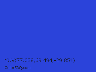 YUV 77.038,69.494,-29.851 Color is a normal blue color and the nearest color is Palatinate Blue #273be2. Hex code #2b43da and RGB value is rgb(43,67,218). In RGB color space, this color is composed of 17% red, 26% green, 85% blue, In CMYK color space, this color is composed of 80% cyan, 69% magenta, 0% yellow , 15% black , In HSL color space, this color has a hue angle of 232° , 70% saturation and 51% lightness.