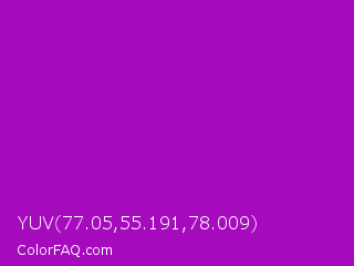 YUV 77.05,55.191,78.009 Color is a normal magenta color and the nearest color is Heliotrope Magenta #aa00bb. Hex code #a60abd and RGB value is rgb(166,10,189). In RGB color space, this color is composed of 65% red, 4% green, 74% blue, In CMYK color space, this color is composed of 12% cyan, 95% magenta, 0% yellow , 26% black , In HSL color space, this color has a hue angle of 292° , 90% saturation and 39% lightness.