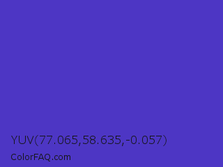 YUV 77.065,58.635,-0.057 Color is a normal indigo color and the nearest color is Ocean Blue #4f42b5. Hex code #4d36c4 and RGB value is rgb(77,54,196). In RGB color space, this color is composed of 30% red, 21% green, 77% blue, In CMYK color space, this color is composed of 61% cyan, 72% magenta, 0% yellow , 23% black , In HSL color space, this color has a hue angle of 250° , 57% saturation and 49% lightness.