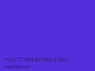 YUV 77.084,69.965,6.065 Color is a normal indigo color and the nearest color is Purple Heart Crayola #652dc1. Hex code #542edb and RGB value is rgb(84,46,219). In RGB color space, this color is composed of 33% red, 18% green, 86% blue, In CMYK color space, this color is composed of 62% cyan, 79% magenta, 0% yellow , 14% black , In HSL color space, this color has a hue angle of 253° , 71% saturation and 52% lightness.
