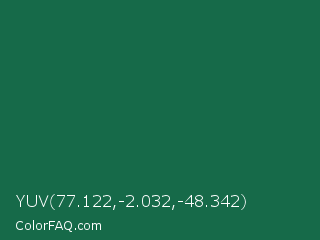 YUV 77.122,-2.032,-48.342 Color is a dark green color and the nearest color is Dark Spring Green #177245. Hex code #166a49 and RGB value is rgb(22,106,73). In RGB color space, this color is composed of 9% red, 42% green, 29% blue, In CMYK color space, this color is composed of 79% cyan, 0% magenta, 31% yellow , 58% black , In HSL color space, this color has a hue angle of 156° , 66% saturation and 25% lightness.