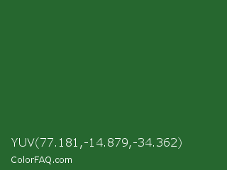 YUV 77.181,-14.879,-34.362 Color is a dark green color and the nearest color is Mughal Green #306030. Hex code #26672f and RGB value is rgb(38,103,47). In RGB color space, this color is composed of 15% red, 40% green, 18% blue, In CMYK color space, this color is composed of 63% cyan, 0% magenta, 54% yellow , 60% black , In HSL color space, this color has a hue angle of 128° , 46% saturation and 28% lightness.