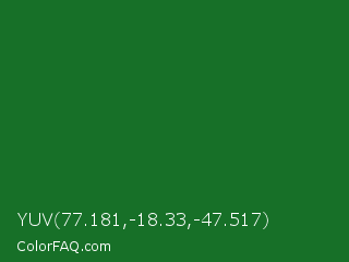YUV 77.181,-18.33,-47.517 Color is a dark green color and the nearest color is La Salle Green #087830. Hex code #177028 and RGB value is rgb(23,112,40). In RGB color space, this color is composed of 9% red, 44% green, 16% blue, In CMYK color space, this color is composed of 79% cyan, 0% magenta, 64% yellow , 56% black , In HSL color space, this color has a hue angle of 131° , 66% saturation and 26% lightness.
