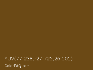 YUV 77.238,-27.725,26.101 Color is a dark orange color and the nearest color is Raw Umber #734a12. Hex code #6b4915 and RGB value is rgb(107,73,21). In RGB color space, this color is composed of 42% red, 29% green, 8% blue, In CMYK color space, this color is composed of 0% cyan, 32% magenta, 80% yellow , 58% black , In HSL color space, this color has a hue angle of 36° , 67% saturation and 25% lightness.