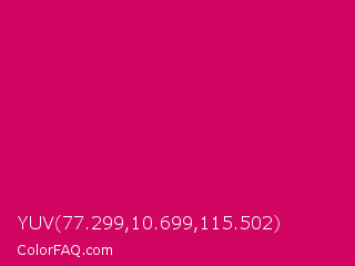 YUV 77.299,10.699,115.502 Color is a normal rose color and the nearest color is Rubine Red #d10056. Hex code #d10663 and RGB value is rgb(209,6,99). In RGB color space, this color is composed of 82% red, 2% green, 39% blue, In CMYK color space, this color is composed of 0% cyan, 97% magenta, 53% yellow , 18% black , In HSL color space, this color has a hue angle of 333° , 94% saturation and 42% lightness.