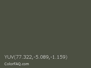 YUV 77.322,-5.089,-1.159 Color is a dark lime color and the nearest color is Gray Asparagus #465945. Hex code #4c5043 and RGB value is rgb(76,80,67). In RGB color space, this color is composed of 30% red, 31% green, 26% blue, In CMYK color space, this color is composed of 5% cyan, 0% magenta, 16% yellow , 69% black , In HSL color space, this color has a hue angle of 78° , 9% saturation and 29% lightness.
