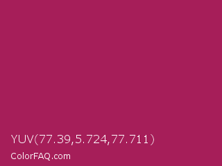 YUV 77.39,5.724,77.711 Color is a normal rose color and the nearest color is Amaranth Purple #ab274f. Hex code #a61e59 and RGB value is rgb(166,30,89). In RGB color space, this color is composed of 65% red, 12% green, 35% blue, In CMYK color space, this color is composed of 0% cyan, 82% magenta, 46% yellow , 35% black , In HSL color space, this color has a hue angle of 334° , 69% saturation and 38% lightness.