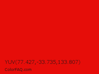YUV 77.427,-33.735,133.807 Color is a normal red color and the nearest color is KU Crimson #e8000d. Hex code #e60d09 and RGB value is rgb(230,13,9). In RGB color space, this color is composed of 90% red, 5% green, 4% blue, In CMYK color space, this color is composed of 0% cyan, 94% magenta, 96% yellow , 10% black , In HSL color space, this color has a hue angle of 1° , 92% saturation and 47% lightness.