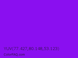 YUV 77.427,80.148,53.123 Color is a normal purple color and the nearest color is Electric Violet #8b00ff. Hex code #8a0ff0 and RGB value is rgb(138,15,240). In RGB color space, this color is composed of 54% red, 6% green, 94% blue, In CMYK color space, this color is composed of 43% cyan, 94% magenta, 0% yellow , 6% black , In HSL color space, this color has a hue angle of 273° , 88% saturation and 50% lightness.