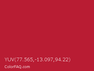 YUV 77.565,-13.097,94.22 Color is a normal red color and the nearest color is Cardinal #c41e3a. Hex code #b91c33 and RGB value is rgb(185,28,51). In RGB color space, this color is composed of 73% red, 11% green, 20% blue, In CMYK color space, this color is composed of 0% cyan, 85% magenta, 72% yellow , 27% black , In HSL color space, this color has a hue angle of 351° , 74% saturation and 42% lightness.