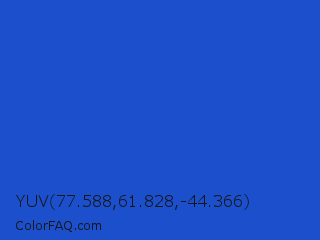 YUV 77.588,61.828,-44.366 Color is a normal blue color and the nearest color is New Car #214fc6. Hex code #1b4fcb and RGB value is rgb(27,79,203). In RGB color space, this color is composed of 11% red, 31% green, 80% blue, In CMYK color space, this color is composed of 87% cyan, 61% magenta, 0% yellow , 20% black , In HSL color space, this color has a hue angle of 222° , 77% saturation and 45% lightness.