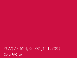 YUV 77.624,-5.731,111.709 Color is a normal rose color and the nearest color is Pictorial Carmine #c30b4e. Hex code #cd0f42 and RGB value is rgb(205,15,66). In RGB color space, this color is composed of 80% red, 6% green, 26% blue, In CMYK color space, this color is composed of 0% cyan, 93% magenta, 68% yellow , 20% black , In HSL color space, this color has a hue angle of 344° , 86% saturation and 43% lightness.