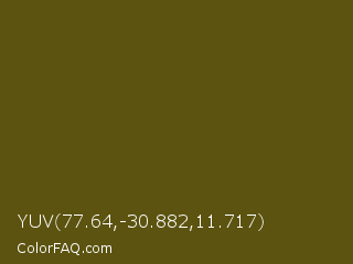 YUV 77.64,-30.882,11.717 Color is a very dark yellow color and the nearest color is Saratoga #555b10. Hex code #5b530f and RGB value is rgb(91,83,15). In RGB color space, this color is composed of 36% red, 33% green, 6% blue, In CMYK color space, this color is composed of 0% cyan, 9% magenta, 84% yellow , 64% black , In HSL color space, this color has a hue angle of 54° , 72% saturation and 21% lightness.