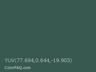 YUV 77.694,0.644,-19.903 Color is a dark green color and the nearest color is Stromboli #325d52. Hex code #37594f and RGB value is rgb(55,89,79). In RGB color space, this color is composed of 22% red, 35% green, 31% blue, In CMYK color space, this color is composed of 38% cyan, 0% magenta, 11% yellow , 65% black , In HSL color space, this color has a hue angle of 162° , 24% saturation and 28% lightness.