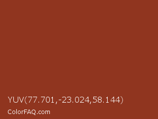 YUV 77.701,-23.024,58.144 Color is a normal red color and the nearest color is Burnt Umber #8a3324. Hex code #90351f and RGB value is rgb(144,53,31). In RGB color space, this color is composed of 56% red, 21% green, 12% blue, In CMYK color space, this color is composed of 0% cyan, 63% magenta, 78% yellow , 44% black , In HSL color space, this color has a hue angle of 12° , 65% saturation and 34% lightness.