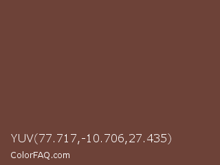 YUV 77.717,-10.706,27.435 Color is a normal red color and the nearest color is Roast Coffee #704241. Hex code #6d4238 and RGB value is rgb(109,66,56). In RGB color space, this color is composed of 43% red, 26% green, 22% blue, In CMYK color space, this color is composed of 0% cyan, 39% magenta, 49% yellow , 57% black , In HSL color space, this color has a hue angle of 11° , 32% saturation and 32% lightness.