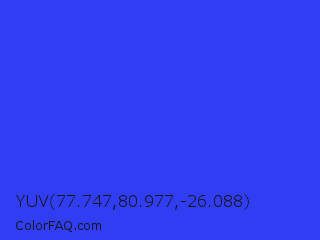 YUV 77.747,80.977,-26.088 Color is a normal blue color and the nearest color is Palatinate Blue #273be2. Hex code #303df2 and RGB value is rgb(48,61,242). In RGB color space, this color is composed of 19% red, 24% green, 95% blue, In CMYK color space, this color is composed of 80% cyan, 75% magenta, 0% yellow , 5% black , In HSL color space, this color has a hue angle of 236° , 88% saturation and 57% lightness.