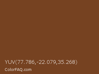 YUV 77.786,-22.079,35.268 Color is a dark orange color and the nearest color is Walnut #773f1a. Hex code #764221 and RGB value is rgb(118,66,33). In RGB color space, this color is composed of 46% red, 26% green, 13% blue, In CMYK color space, this color is composed of 0% cyan, 44% magenta, 72% yellow , 54% black , In HSL color space, this color has a hue angle of 23° , 56% saturation and 30% lightness.