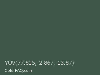 YUV 77.815,-2.867,-13.87 Color is a dark green color and the nearest color is Gray Asparagus #465945. Hex code #3e5748 and RGB value is rgb(62,87,72). In RGB color space, this color is composed of 24% red, 34% green, 28% blue, In CMYK color space, this color is composed of 29% cyan, 0% magenta, 17% yellow , 66% black , In HSL color space, this color has a hue angle of 144° , 17% saturation and 29% lightness.