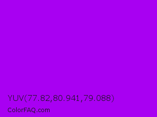 YUV 77.82,80.941,79.088 Color is a normal purple color and the nearest color is Vivid Violet #9f00ff. Hex code #a800f2 and RGB value is rgb(168,-0,242). In RGB color space, this color is composed of 66% red, 0% green, 95% blue, In CMYK color space, this color is composed of 31% cyan, 100% magenta, 0% yellow , 5% black , In HSL color space, this color has a hue angle of 282° , 100% saturation and 47% lightness.