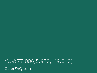 YUV 77.886,5.972,-49.012 Color is a dark cyan color and the nearest color is Watercourse #056f57. Hex code #16685a and RGB value is rgb(22,104,90). In RGB color space, this color is composed of 9% red, 41% green, 35% blue, In CMYK color space, this color is composed of 79% cyan, 0% magenta, 13% yellow , 59% black , In HSL color space, this color has a hue angle of 170° , 65% saturation and 25% lightness.