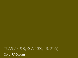 YUV 77.93,-37.433,13.216 Color is a very dark yellow color and the nearest color is Saratoga #555b10. Hex code #5d5502 and RGB value is rgb(93,85,2). In RGB color space, this color is composed of 36% red, 33% green, 1% blue, In CMYK color space, this color is composed of 0% cyan, 9% magenta, 98% yellow , 64% black , In HSL color space, this color has a hue angle of 55° , 96% saturation and 19% lightness.