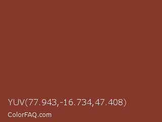 YUV 77.943,-16.734,47.408 Color is a normal red color and the nearest color is Nutmeg #81422c. Hex code #84392c and RGB value is rgb(132,57,44). In RGB color space, this color is composed of 52% red, 22% green, 17% blue, In CMYK color space, this color is composed of 0% cyan, 57% magenta, 67% yellow , 48% black , In HSL color space, this color has a hue angle of 9° , 50% saturation and 35% lightness.