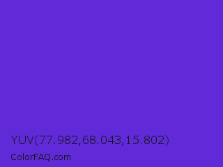 YUV 77.982,68.043,15.802 Color is a normal indigo color and the nearest color is Purple Heart Crayola #652dc1. Hex code #602ad8 and RGB value is rgb(96,42,216). In RGB color space, this color is composed of 38% red, 16% green, 85% blue, In CMYK color space, this color is composed of 56% cyan, 81% magenta, 0% yellow , 15% black , In HSL color space, this color has a hue angle of 259° , 69% saturation and 51% lightness.
