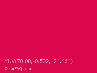 YUV 78.08,-0.532,124.464 Color is a normal rose color and the nearest color is UA Red #d9004c. Hex code #dc064d and RGB value is rgb(220,6,77). In RGB color space, this color is composed of 86% red, 2% green, 30% blue, In CMYK color space, this color is composed of 0% cyan, 97% magenta, 65% yellow , 14% black , In HSL color space, this color has a hue angle of 340° , 95% saturation and 44% lightness.