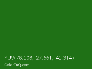 YUV 78.108,-27.661,-41.314 Color is a dark green color and the nearest color is Bilbao #327c14. Hex code #1f7116 and RGB value is rgb(31,113,22). In RGB color space, this color is composed of 12% red, 44% green, 9% blue, In CMYK color space, this color is composed of 73% cyan, 0% magenta, 81% yellow , 56% black , In HSL color space, this color has a hue angle of 114° , 67% saturation and 26% lightness.