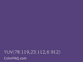 YUV 78.119,23.112,6.912 Color is a normal violet color and the nearest color is Cyber Grape #58427c. Hex code #56417d and RGB value is rgb(86,65,125). In RGB color space, this color is composed of 34% red, 25% green, 49% blue, In CMYK color space, this color is composed of 31% cyan, 48% magenta, 0% yellow , 51% black , In HSL color space, this color has a hue angle of 261° , 32% saturation and 37% lightness.
