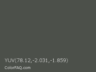 YUV 78.12,-2.031,-1.859 Color is a dark green color and the nearest color is Fuscous Gray #54534d. Hex code #4c504a and RGB value is rgb(76,80,74). In RGB color space, this color is composed of 30% red, 31% green, 29% blue, In CMYK color space, this color is composed of 5% cyan, 0% magenta, 8% yellow , 69% black , In HSL color space, this color has a hue angle of 100° , 4% saturation and 30% lightness.