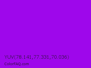 YUV 78.141,77.331,70.036 Color is a normal purple color and the nearest color is Vivid Violet #9f00ff. Hex code #9e07eb and RGB value is rgb(158,7,235). In RGB color space, this color is composed of 62% red, 3% green, 92% blue, In CMYK color space, this color is composed of 33% cyan, 97% magenta, 0% yellow , 8% black , In HSL color space, this color has a hue angle of 280° , 94% saturation and 47% lightness.