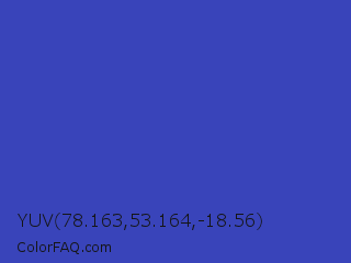 YUV 78.163,53.164,-18.56 Color is a normal blue color and the nearest color is Violet Blue #324ab2. Hex code #3944ba and RGB value is rgb(57,68,186). In RGB color space, this color is composed of 22% red, 27% green, 73% blue, In CMYK color space, this color is composed of 69% cyan, 63% magenta, 0% yellow , 27% black , In HSL color space, this color has a hue angle of 235° , 53% saturation and 48% lightness.