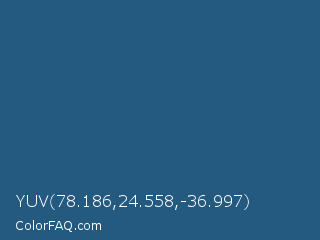 YUV 78.186,24.558,-36.997 Color is a normal blue color and the nearest color is Blumine #18587a. Hex code #245a80 and RGB value is rgb(36,90,128). In RGB color space, this color is composed of 14% red, 35% green, 50% blue, In CMYK color space, this color is composed of 72% cyan, 30% magenta, 0% yellow , 50% black , In HSL color space, this color has a hue angle of 205° , 56% saturation and 32% lightness.