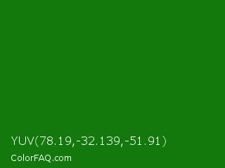 YUV 78.19,-32.139,-51.91 Color is a dark green color and the nearest color is India Green #138808. Hex code #13790d and RGB value is rgb(19,121,13). In RGB color space, this color is composed of 7% red, 47% green, 5% blue, In CMYK color space, this color is composed of 84% cyan, 0% magenta, 89% yellow , 53% black , In HSL color space, this color has a hue angle of 117° , 81% saturation and 26% lightness.