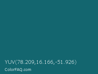 YUV 78.209,16.166,-51.926 Color is a dark cyan color and the nearest color is Genoa #15736b. Hex code #13666f and RGB value is rgb(19,102,111). In RGB color space, this color is composed of 7% red, 40% green, 44% blue, In CMYK color space, this color is composed of 83% cyan, 8% magenta, 0% yellow , 56% black , In HSL color space, this color has a hue angle of 186° , 71% saturation and 25% lightness.