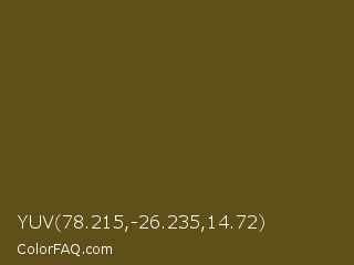 YUV 78.215,-26.235,14.72 Color is a dark yellow color and the nearest color is West Coast #625119. Hex code #5f5019 and RGB value is rgb(95,80,25). In RGB color space, this color is composed of 37% red, 31% green, 10% blue, In CMYK color space, this color is composed of 0% cyan, 16% magenta, 74% yellow , 63% black , In HSL color space, this color has a hue angle of 47° , 58% saturation and 24% lightness.