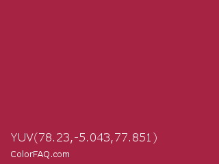 YUV 78.23,-5.043,77.851 Color is a normal red color and the nearest color is Deep Carmine #a9203e. Hex code #a72344 and RGB value is rgb(167,35,68). In RGB color space, this color is composed of 65% red, 14% green, 27% blue, In CMYK color space, this color is composed of 0% cyan, 79% magenta, 59% yellow , 35% black , In HSL color space, this color has a hue angle of 345° , 65% saturation and 40% lightness.