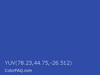 YUV 78.23,44.75,-26.512 Color is a normal blue color and the nearest color is Violet Blue #324ab2. Hex code #304ca9 and RGB value is rgb(48,76,169). In RGB color space, this color is composed of 19% red, 30% green, 66% blue, In CMYK color space, this color is composed of 72% cyan, 55% magenta, 0% yellow , 34% black , In HSL color space, this color has a hue angle of 226° , 56% saturation and 43% lightness.