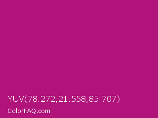 YUV 78.272,21.558,85.707 Color is a normal magenta color and the nearest color is Red Violet #c71585. Hex code #b0147a and RGB value is rgb(176,20,122). In RGB color space, this color is composed of 69% red, 8% green, 48% blue, In CMYK color space, this color is composed of 0% cyan, 89% magenta, 31% yellow , 31% black , In HSL color space, this color has a hue angle of 321° , 80% saturation and 38% lightness.