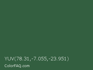YUV 78.31,-7.055,-23.951 Color is a dark green color and the nearest color is Hunter Green #355e3b. Hex code #335f40 and RGB value is rgb(51,95,64). In RGB color space, this color is composed of 20% red, 37% green, 25% blue, In CMYK color space, this color is composed of 46% cyan, 0% magenta, 33% yellow , 63% black , In HSL color space, this color has a hue angle of 138° , 30% saturation and 29% lightness.
