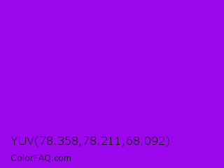 YUV 78.358,78.211,68.092 Color is a normal purple color and the nearest color is Vivid Violet #9f00ff. Hex code #9c08ed and RGB value is rgb(156,8,237). In RGB color space, this color is composed of 61% red, 3% green, 93% blue, In CMYK color space, this color is composed of 34% cyan, 97% magenta, 0% yellow , 7% black , In HSL color space, this color has a hue angle of 279° , 93% saturation and 48% lightness.