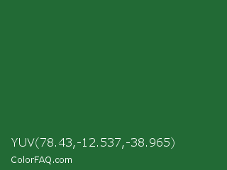 YUV 78.43,-12.537,-38.965 Color is a dark green color and the nearest color is Green Pea #1d6142. Hex code #226a35 and RGB value is rgb(34,106,53). In RGB color space, this color is composed of 13% red, 42% green, 21% blue, In CMYK color space, this color is composed of 68% cyan, 0% magenta, 50% yellow , 58% black , In HSL color space, this color has a hue angle of 136° , 51% saturation and 27% lightness.