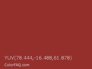 YUV 78.444,-16.488,61.878 Color is a normal red color and the nearest color is Stiletto #9c3336. Hex code #95312d and RGB value is rgb(149,49,45). In RGB color space, this color is composed of 58% red, 19% green, 18% blue, In CMYK color space, this color is composed of 0% cyan, 67% magenta, 70% yellow , 42% black , In HSL color space, this color has a hue angle of 2° , 54% saturation and 38% lightness.
