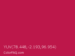 YUV 78.448,-2.193,96.954 Color is a normal rose color and the nearest color is Maroon Flush #c32148. Hex code #bd174a and RGB value is rgb(189,23,74). In RGB color space, this color is composed of 74% red, 9% green, 29% blue, In CMYK color space, this color is composed of 0% cyan, 88% magenta, 61% yellow , 26% black , In HSL color space, this color has a hue angle of 342° , 78% saturation and 42% lightness.