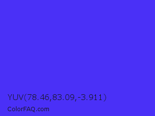 YUV 78.46,83.09,-3.911 Color is a normal indigo color and the nearest color is Han Purple #5218fa. Hex code #4a30f7 and RGB value is rgb(74,48,247). In RGB color space, this color is composed of 29% red, 19% green, 97% blue, In CMYK color space, this color is composed of 70% cyan, 81% magenta, 0% yellow , 3% black , In HSL color space, this color has a hue angle of 248° , 93% saturation and 58% lightness.